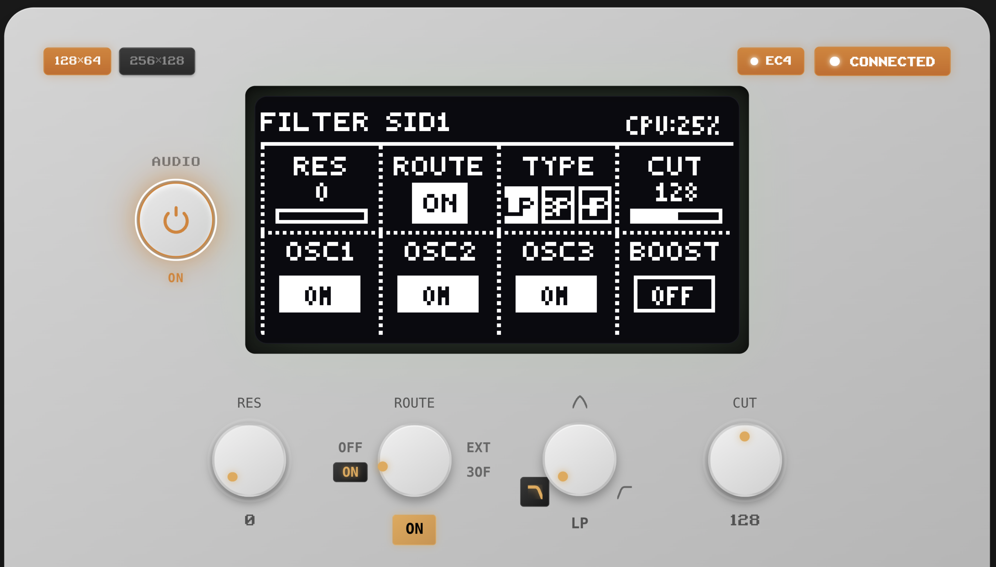 | Display | 256x128 4-bit greyscale OLED |